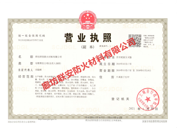 廊坊联安防火材料有限公司是由具有防火知识和丰富实践经验的高、中级科技人员组成。距离首都北京150公里,地理位置优越,交通便利,公司技术力量雄厚,是一家集科研,生产,销售,施工配套服务于一体的防火材料生产企业。